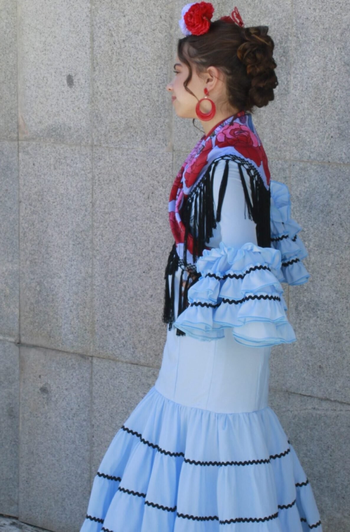 Este vestido de flamenca para niña, talle 10, está confeccionado artesanalmente en Andalucía, con tejidos ligeros y detalles que evocan la tradición más pura del sur. Su diseño combina volantes amplios, manga larga y un corte cómodo que permite libertad de movimiento, ideal para ferias, romerías o sesiones de fotos.